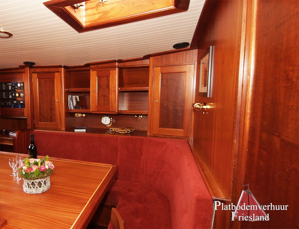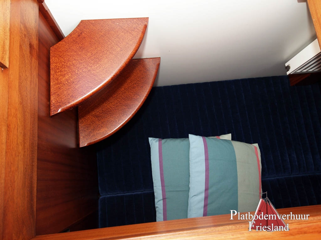 Comfortabel interieur met slaapgelegenheid voor max. 10 personen, waaronder vier slaapplaatsen in de voorkajuit, twee in de zithoek in de salon en vier in het achteronder (toegankelijk via het doghouse en ook van de salon), een kombuis aan stuurboord in de salon met gasfornuis, oven en koelkast, U - bank met tafel.
