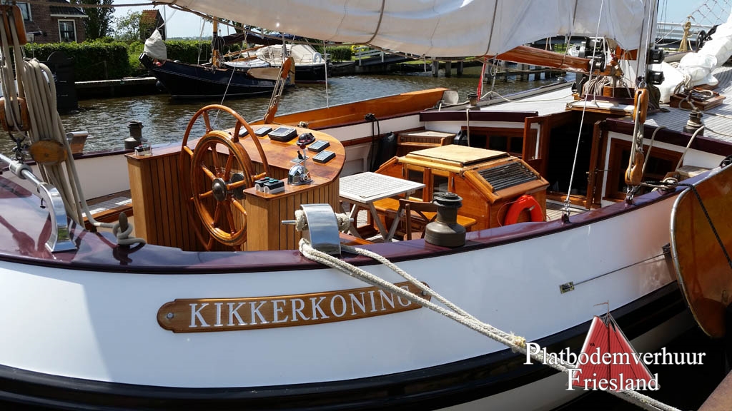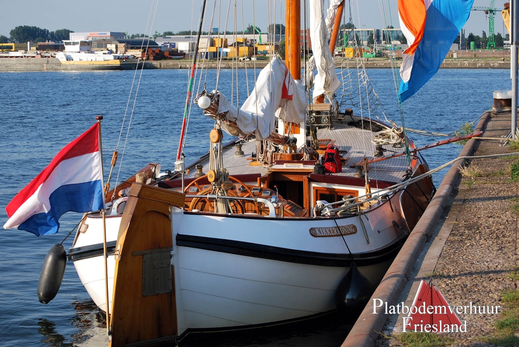Een elegante witte Visserman Aak KIKKERKONING , gebouwd in 1995. Een zeer ruime platbodem, in het hele schip stahoogte !