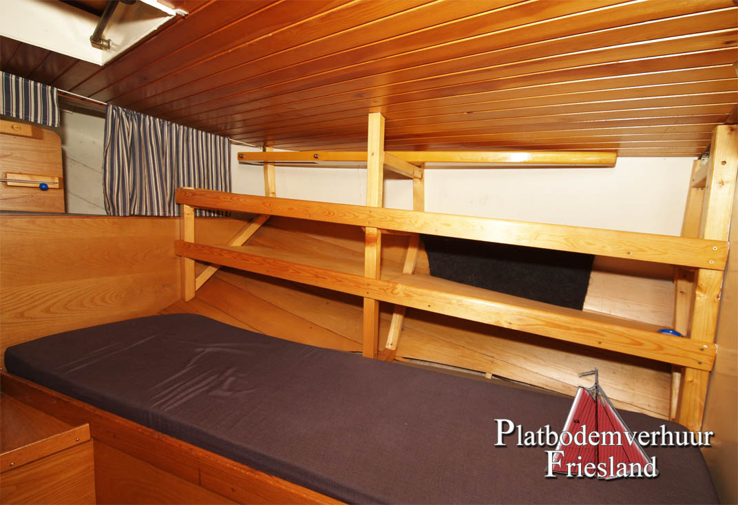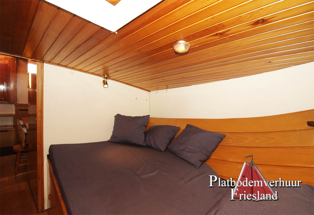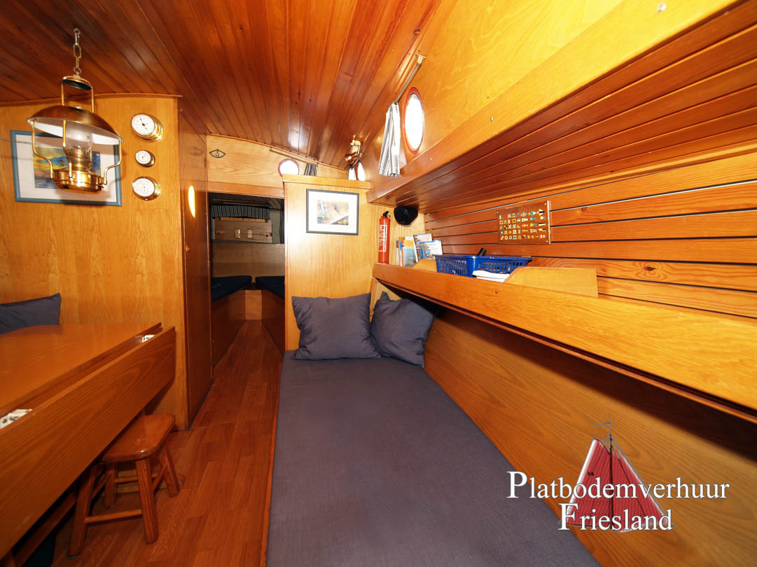 Der Salon bietet den Gästen viel Platz auf den beiden gegenüberliegenden Sitzbänken (die Nachts als Schlafplätze genutzt werden können), im Vooronder finden sich zwei Einzelkojen und Staufächer für Gepäck.