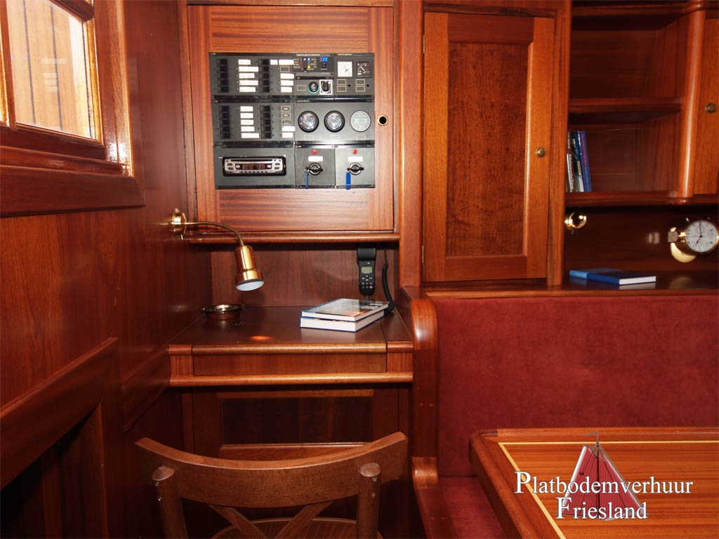 Comfortabel interieur met slaapgelegenheid voor max. 10 personen, waaronder vier slaapplaatsen in de voorkajuit, twee in de zithoek in de salon en vier in het achteronder (toegankelijk via het doghouse en ook van de salon), een kombuis aan stuurboord in de salon met gasfornuis, oven en koelkast, U - bank met tafel.