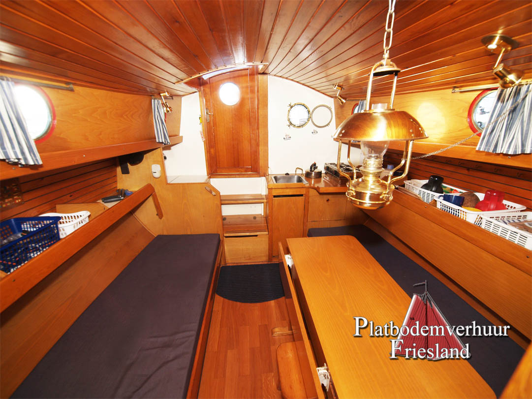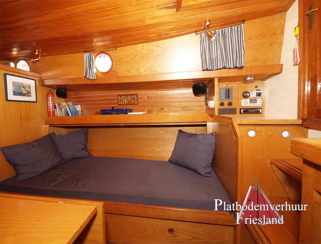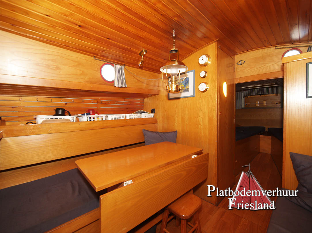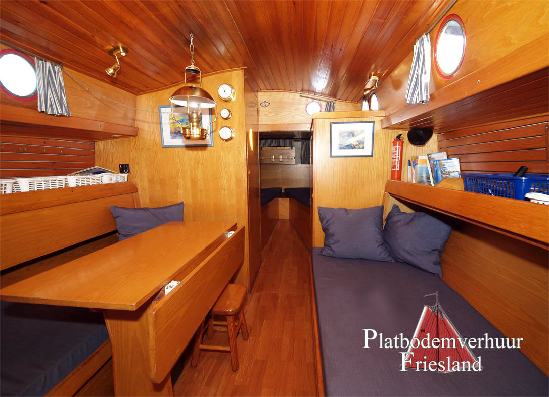 Der Salon bietet den Gästen viel Platz auf den beiden gegenüberliegenden Sitzbänken (die Nachts als Schlafplätze genutzt werden können), im Vooronder finden sich zwei Einzelkojen und Staufächer für Gepäck.