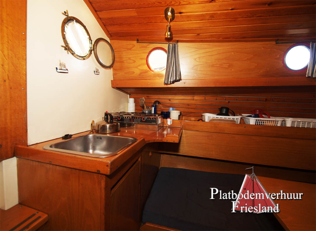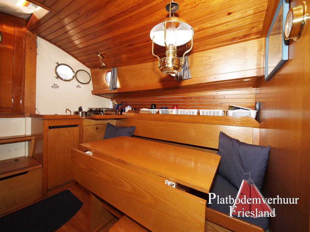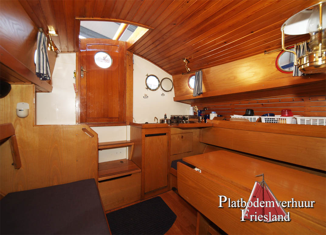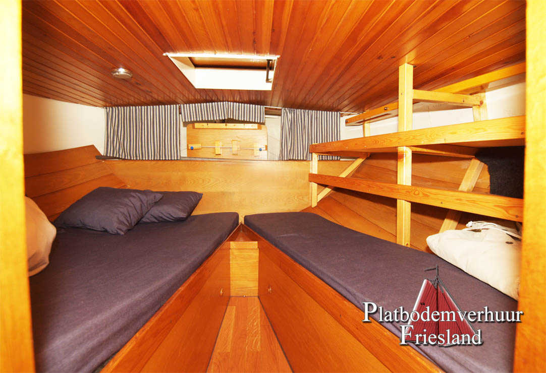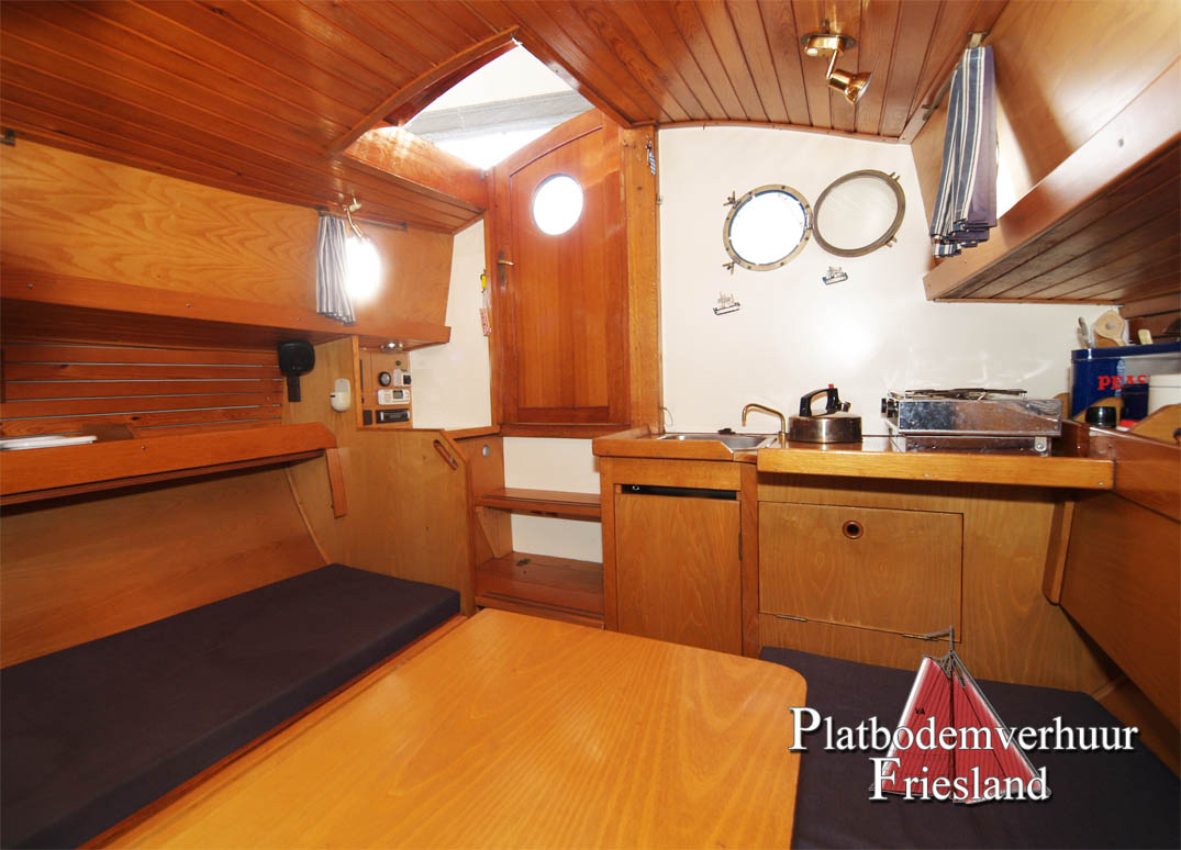 Der Salon bietet den Gästen viel Platz auf den beiden gegenüberliegenden Sitzbänken (die Nachts als Schlafplätze genutzt werden können), im Vooronder finden sich zwei Einzelkojen und Staufächer für Gepäck.